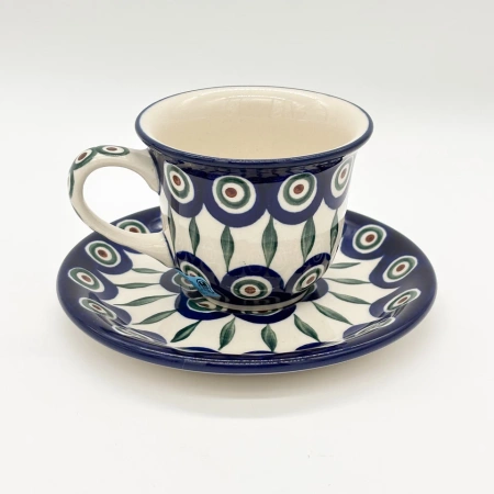 Diese Tasse mit Untertasse wurde in traditioneller Handwerkskunst in Bolesławiec (Bunzlau) hergestellt und ist handbemalt.
