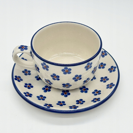 Diese Tasse mit Untertasse wurde in traditioneller Handwerkskunst in Bolesławiec (Bunzlau) hergestellt und ist handbemalt.